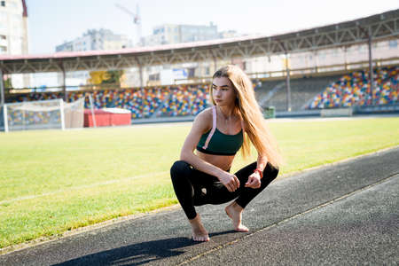 Young sprinter woman in sportswear tying shoelaces before a race on a red-coated stadium track at sunny bright day