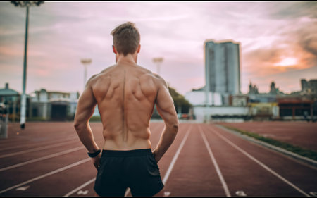 Back view of a focused athlete poised on the starting line of a track, bathed in the early morning sunlight.