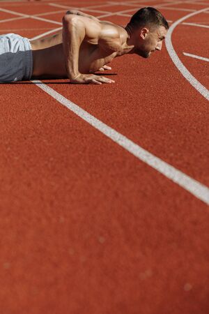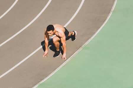 Male athlete on starting position at running track. Runner practicing run in stadium racetrack