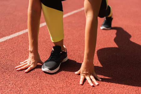 Young runner woman in sportwear getting ready to run sprint at low start on stadium track with red coated at bright sunny day. Crop photo