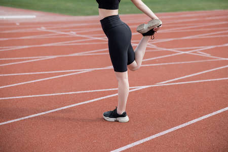 cropped view of sportswoman in black bike shorts stretching leg on stadium