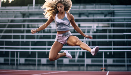 Long jump Full length of modern young woman in sports clothing jumping while exercising outdoors : Generative AI