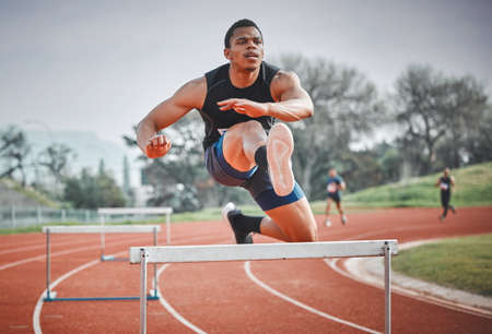 Navigating obstacles with ease. Full length shot of a handsome young male athlete practicing hurdles on an outdoor track.