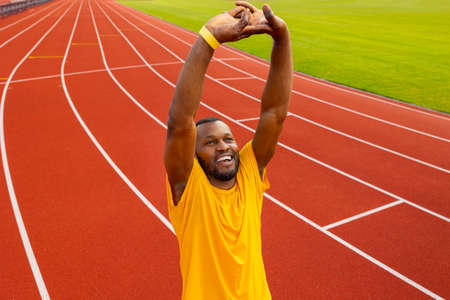 Cheerful young african american guy warming up, stretching hands, doing hand stretching exercise. Male runner athlete working out outdoors at the stadium wearing yellow sportswear. High quality photo