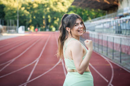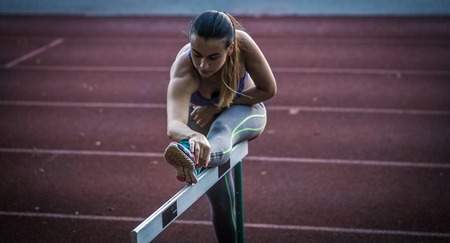 Image of a young female runner laces her shoes on a stadium track. Sports concept. Mixed media