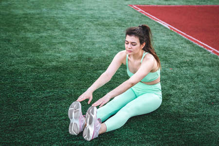 young beautiful girl doing warm-up before sports exercise at school stadium