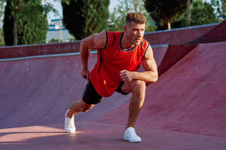 Concentrated athlete doing push ups outside. Sportsman. Strong man