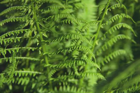 Ferns in the forest. Beautiful background of ferns green foliage leaves. Dense thickets of beautiful growing ferns in the forest. Natural floral fern background on a sunny day