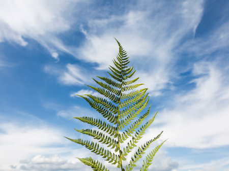 Fern leaf in light green colors on a sky background, greenery branch, twig, stem, forest plant, stationery