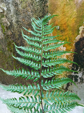 Fern leaf on dark wooden surface