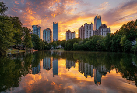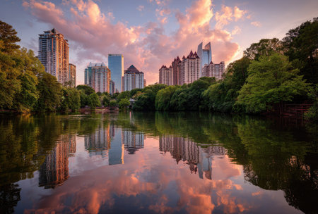 A cityscape is reflected in a still lake, the sky filled with pastel colors. Tall buildings and lush trees frame the water. The composition highlights reflections and light play. Suitable for various uses, this image could serve commercial or illustrative purposes.