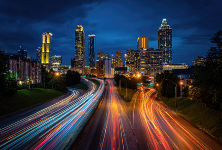 A nighttime cityscape showcasing illuminated skyscrapers with dynamic trails of vehicle lights. The composition features a vibrant sky and contrasting light patterns. Suitable for commercial applications, the image conveys a sense of urban life and movement. The scene is presented with a long exposure and a focus on architectural elements.