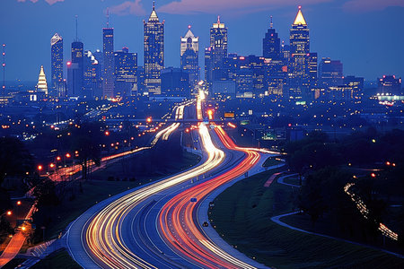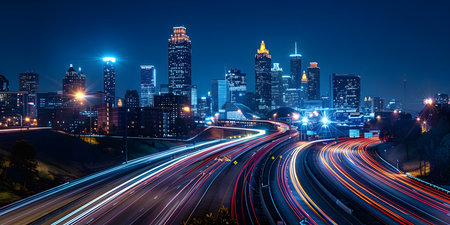 A scenic view of a bustling highway at night, with streams of car lights creating vibrant trails against the dark backdrop of a city skyline, showcasing urban transportation