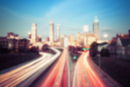 Late afternoon sunny summer day in downtown Atlanta looking from a birdseye aerial view over the highway