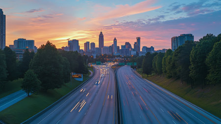 A stunning sunset paints the sky over an urban skyline, highlighting the smooth flow of traffic on the highway below, capturing the essence of city life.