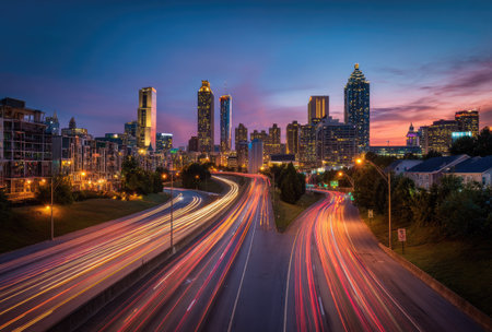 A city skyline is viewed at dusk, featuring a highway with streaks of light from passing vehicles. Buildings are illuminated against a colorful sky. This image showcases urban development and could be used for various commercial or editorial applications.
