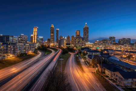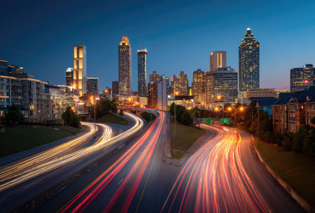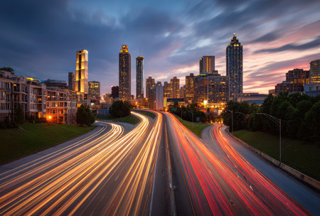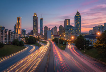 An urban scene depicts a city skyline at dusk, with light trails from vehicle traffic. The composition reveals a highway leading into the heart of the city, framed by illuminated buildings. The image exhibits a color palette of warm and cool tones. It could be useful for marketing, editorial content, or design projects.