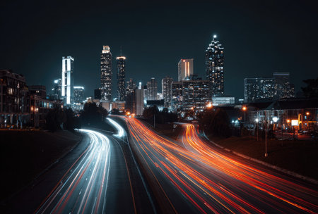 A stunning nighttime view of a bustling highway with vibrant light trails from moving vehicles, framed by a modern city skyline, showcasing urban life and energy.