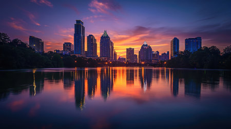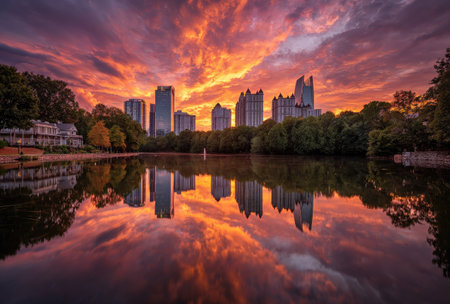 A vibrant cityscape is reflected in tranquil water, showcasing a stunning sunset. The sky is ablaze with orange and purple hues, reflecting off the water's surface. Trees frame the buildings, enhancing the composition and offering a serene atmosphere. This image is suitable for various commercial purposes, including marketing and design projects.