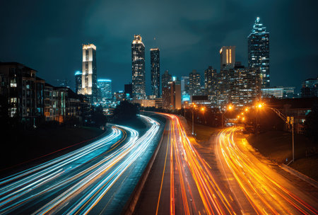 A nighttime cityscape showcasing illuminated skyscrapers with dynamic trails of vehicle lights. The composition features a vibrant sky and contrasting light patterns. Suitable for commercial applications, the image conveys a sense of urban life and movement. The scene is presented with a long exposure and a focus on architectural elements.