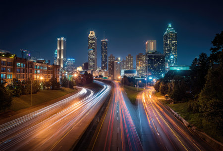 An aerial nighttime view captures a bustling cityscape with numerous illuminated skyscrapers. A multilane highway showcases blurred streaks of light from moving vehicles. The composition features a symmetrical design with vibrant colors, and dynamic light trails. It is suitable for commercial and editorial applications.