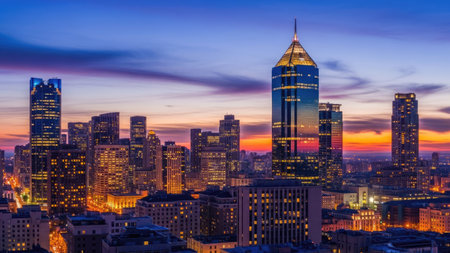 A nighttime cityscape features illuminated high-rise buildings set against a dark blue sky. The composition showcases a variety of architectural styles and bright lights. This image could be suitable for illustrating urban development, business, or general commercial use.
