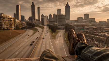 An individual sits with legs outstretched, offering a first-person view of a city skyline. The composition features a highway cutting through a landscape, framed by trees. The image presents a blend of urban and natural elements, bathed in warm sunset hues, suitable for various editorial and commercial applications.