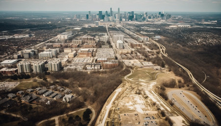 Late afternoon sunny summer day in downtown Atlanta looking from a birdseye aerial view over the highway