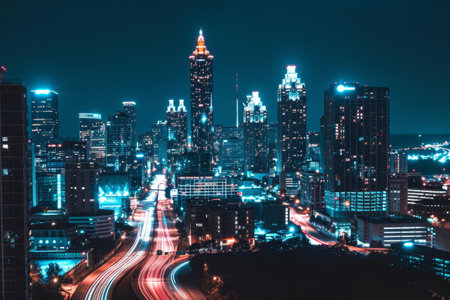 Captivating urban scene showcasing vibrant city lights and dynamic traffic at night, with modern architecture creating a lively metropolitan atmosphere.