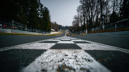 A captivating close-up of a checkered flag on a racing track, showcasing the road's perspective and surrounding natural elements in a moody, atmospheric setting.