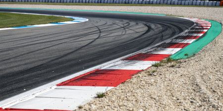 Lonely race track on a sunny day with wide curves and open lanes for copy space, no cars or spectators