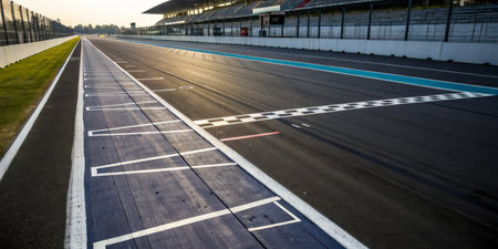 A stunning view of a racing track at sunset with the checkered flag marking in the foreground, emphasizing a sense of speed and excitement in a tranquil atmosphere.