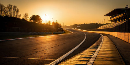As the sun sets on the racetrack, warm hues fill the sky and cast golden light on the empty asphalt. The grandstand looms in the background, evoking a sense of anticipation.