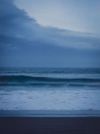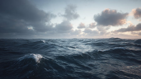 A dramatic ocean scene with dark blue waves and a cloudy sky at sunset