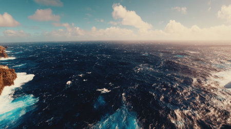 A breathtaking high-angle perspective of the restless sea with white-capped waves hitting a rugged coastline under a partly cloudy sky, evoking a sense of power and vastness.