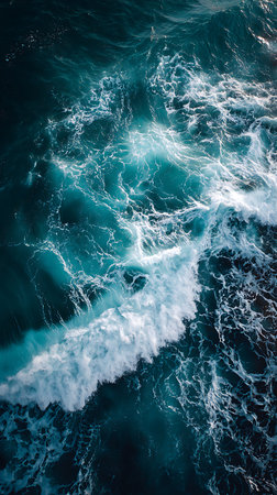 Overhead shot capturing a vivid teal ocean surface. Dynamic wave surges across, creating white foam patterns contrasting against the deep blue of the water below.