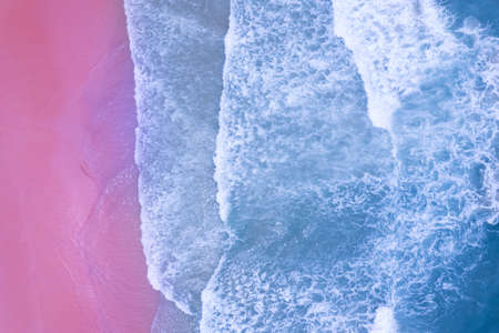 Top view of amazing pastel pink sand beach and turquoise sea copy space available nature background High angle view sea. Summer season greeting background