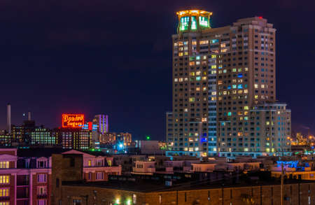 View of the Farley State Marina and skyline at night, in Atlantic City, New Jersey.