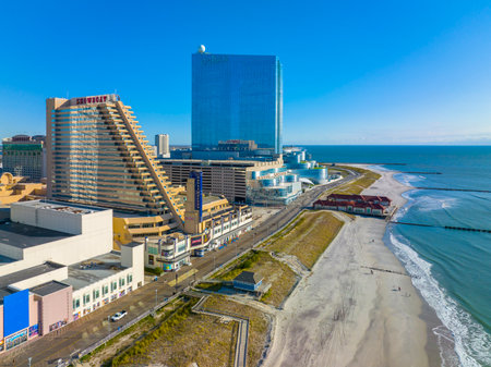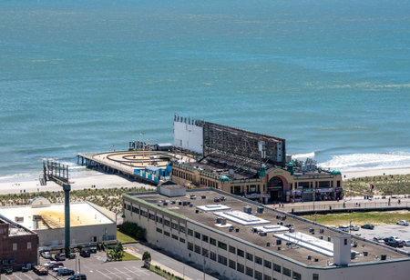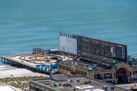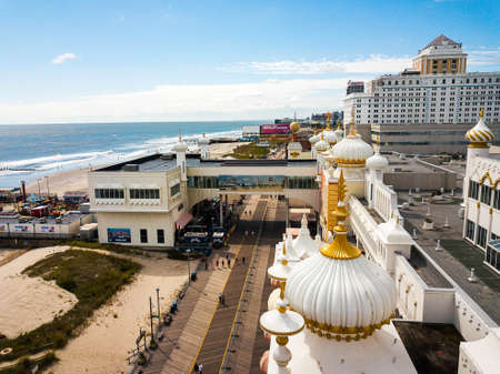 ATLANTIC CITY, USA - SEPTEMBER 20, 2017: Atlantic city boardwalk aerial view. Boardwalk is the hub of casinos, restaurants and travel spots