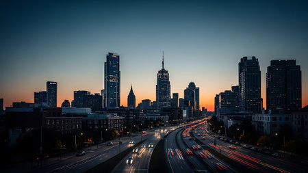 A cityscape at sunset with a busy highway and skyscrapers in the background