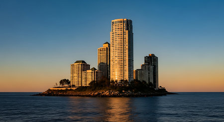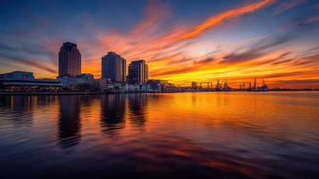 Experience the breathtaking beauty of a city skyline at sunset, with vibrant orange and purple hues reflected in the calm water below, creating a serene and picturesque scene.