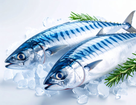AI generated top view of fresh whole mackerel fish with shiny skin and clear eyes arranged neatly showcasing natural silver-blue color against clean white background