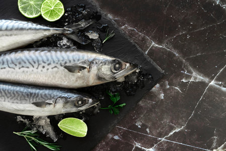 Raw organic mackerel with ingredients for making on a black slate, stone or concrete background. Top view with copy space.