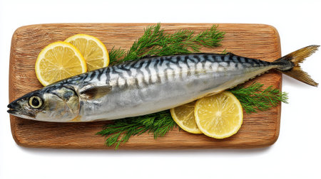 Fresh mackerel fish on wooden cutting board with lemon slices and dill garnish, ready for healthy seafood cooking and culinary preparation.