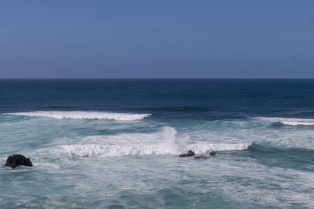 Waves and blue water as a background. View from high rock at the ocean surface. Natural summer seascape. Water background. Bali, Indonesia