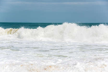 Storm waves in the world ocean. Kind of waves, crests, splashes, foam against the background of the sea and blue sky.