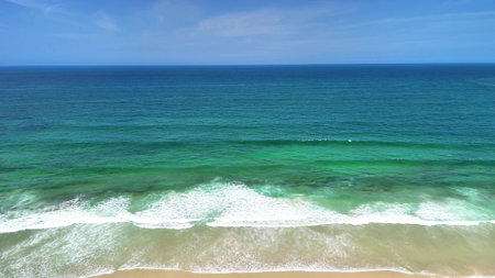 Aerial view of tropical sandy beach and ocean with turquoise water with waves. Sunny day on Atlantic ocean beach in Portugal