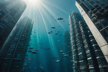 Underwater Business Center: Sharks among Flooded City Streets under Sun Rays