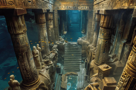Exploring the ancient and mysterious submerged ruins of a mystical underwater temple with hieroglyphics and statues in an eerie sunken city