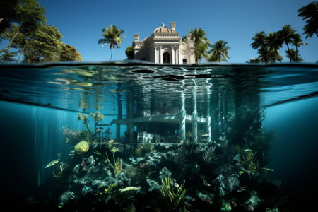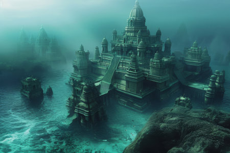 The photo captures an impressive underwater castle surrounded by the vastness of the ocean, A mysterious ancient sunken city, hidden deep underneath the ocean waves, AI Generated
